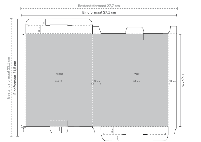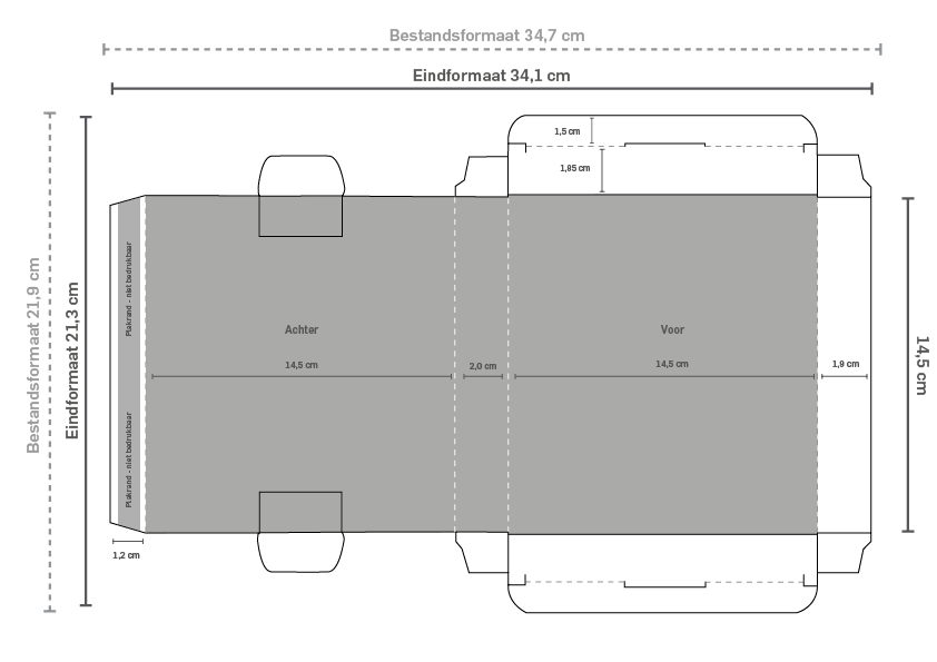 | A5 lang+ | 45 gram | 11,5 x 2 x 30,5 cm | Werktekening |