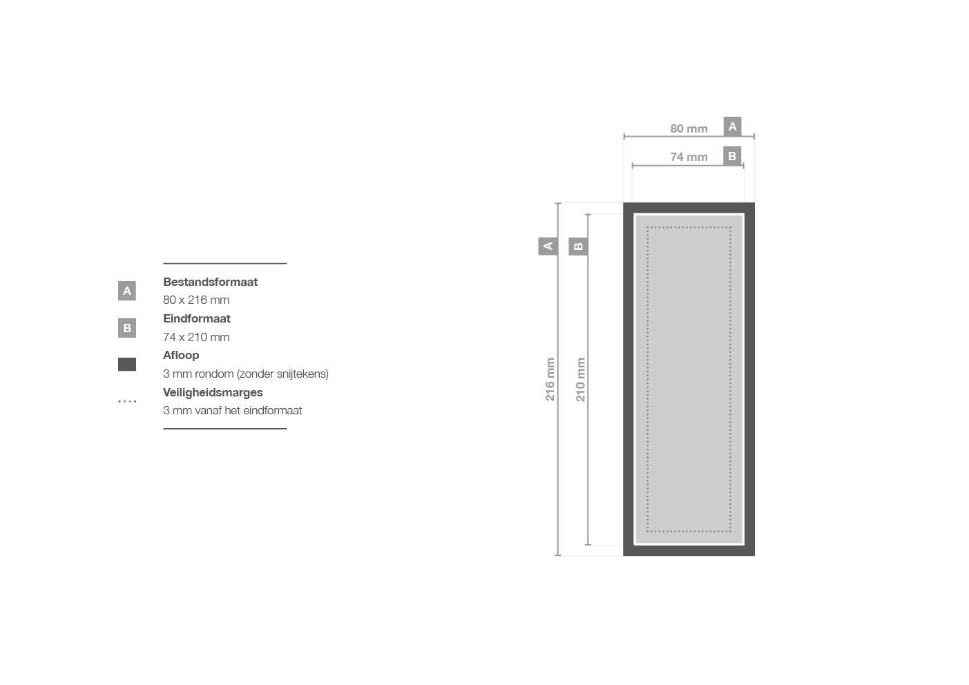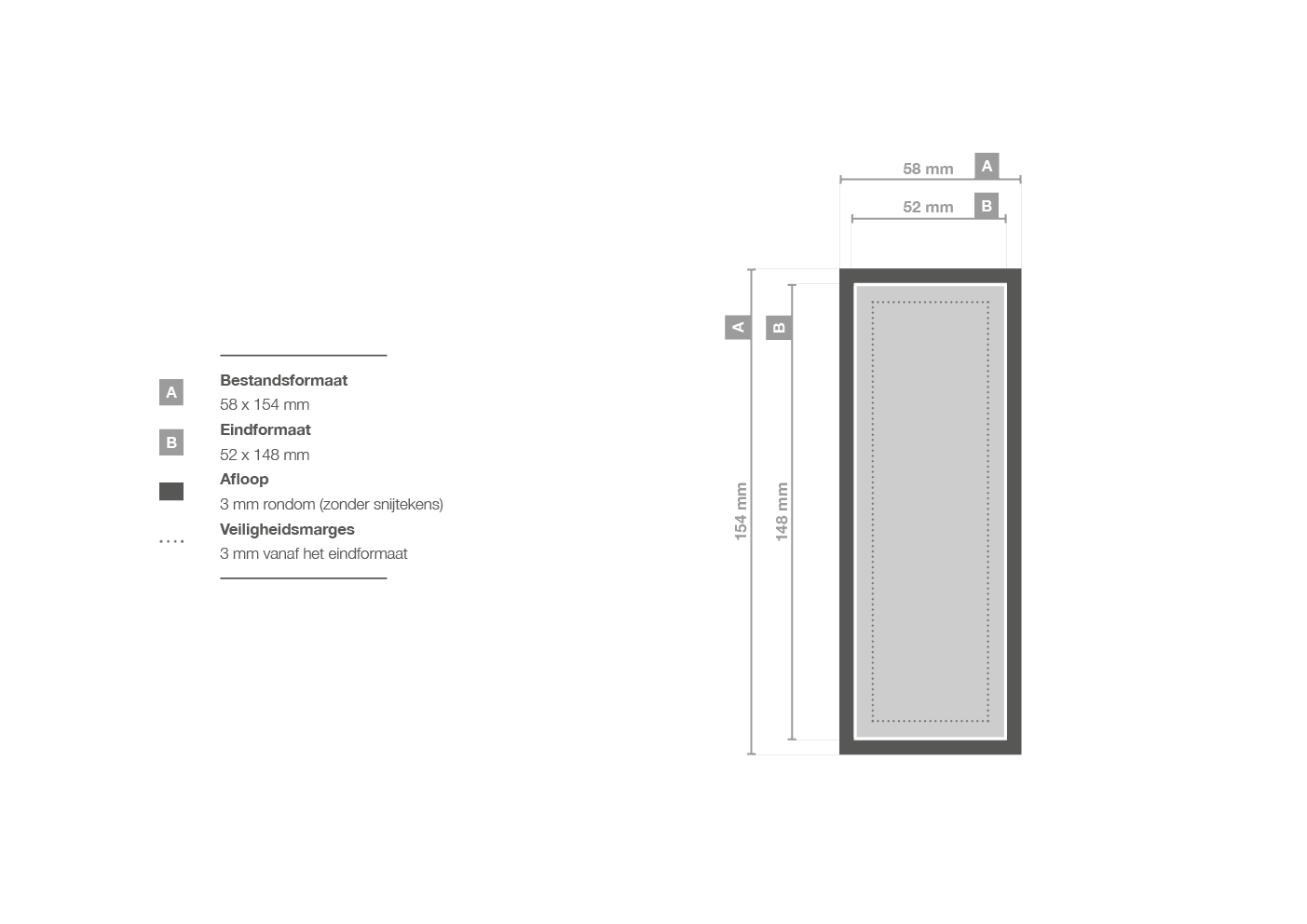 Het meest bestelde formaat boekenlegger is de A7 lang, deze heeft het handige eindformaat van 5,2 x 14,8 cm en past dus perfect bij de meeste boeken. Ook andere formaten zijn uiteraard makkelijk te bestellen. Zelfs het kiezen voor een eigen eindformaat is mogelijk. De onderstaande formaten zijn allemaal te bestellen.
