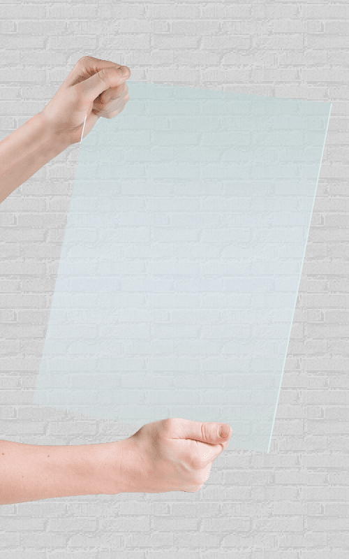 Bij het glasheldere plexiglas kan je, naast de standaard 4/0 full colour bedrukking, ook kiezen voor witte bedrukking. Wil je een volledig witte achtergrond, kies dan voor 4/0 full colour + volledig witte tegendruk. Hierbij wordt een blockout folie aangebracht op het glas, waardoor het glas niet meer transparant is en de kleuren nog helderder worden. Met een lichte bedrukking kan een ophangplaat aan de voorkant zichtbaar zijn. Voor plexiglas raden wij afstandhouders aan voor het mooiste resultaat.