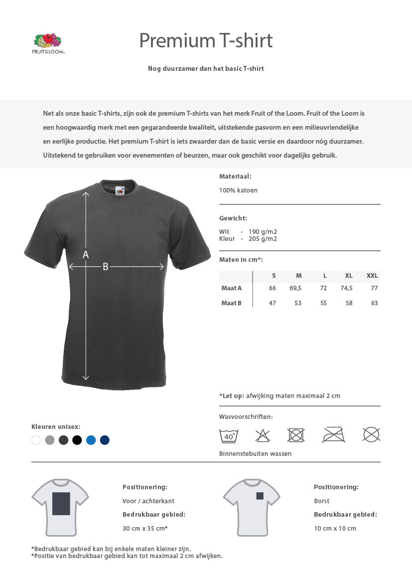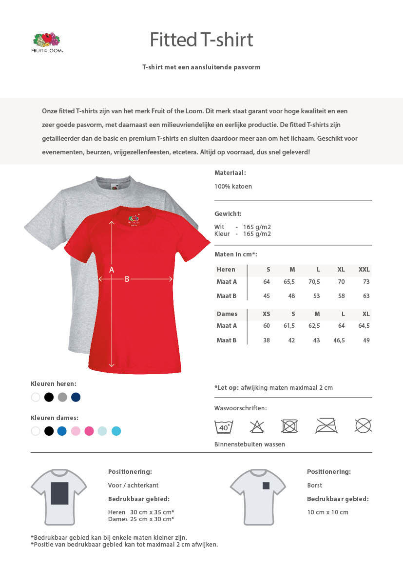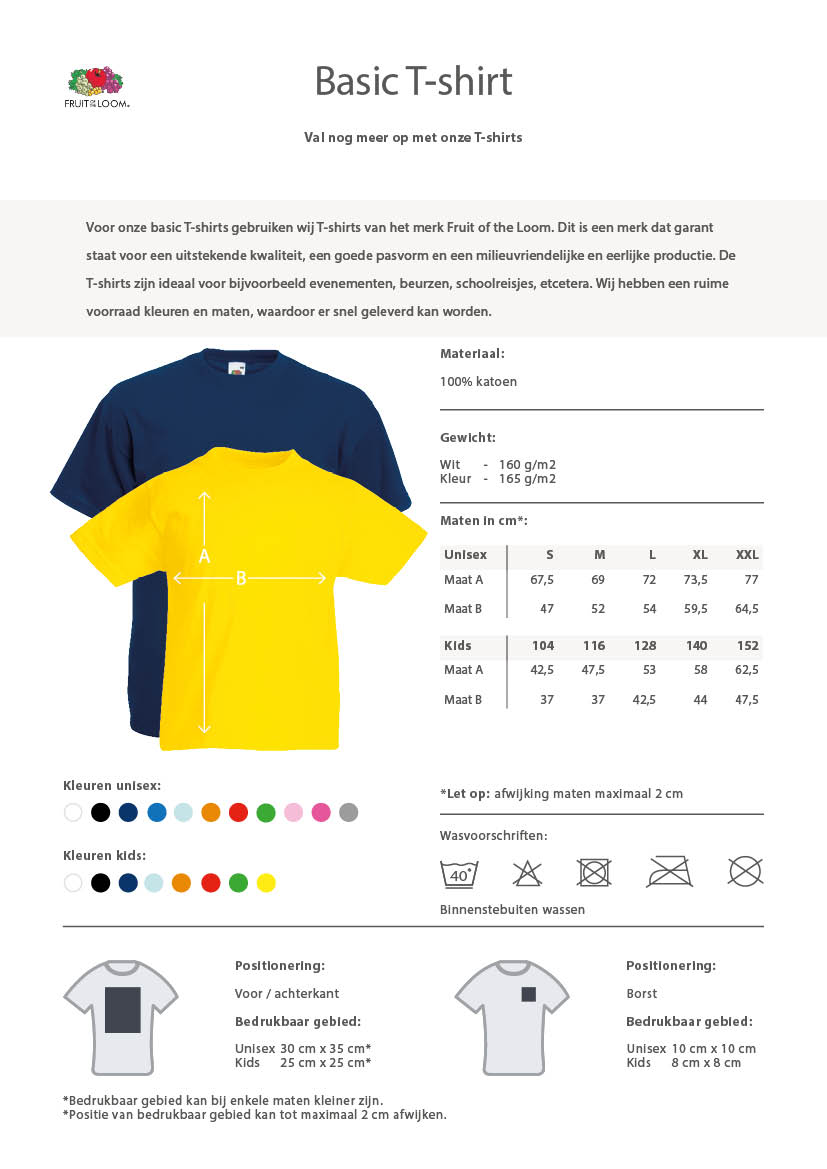 Een t-shirt laten bedrukken door Flyerzone? Dan kies je eerst 1 van de 3 varianten in ons assortiment, altijd gemaakt van 100% katoen. Onze Basic en fitted t-shirts zijn gemaakt van 160/165 grams stof en premium t-shirts van maar liefst 190/205 grams stof! Hieronder vind je meer handige informatie over onze t-shirts.