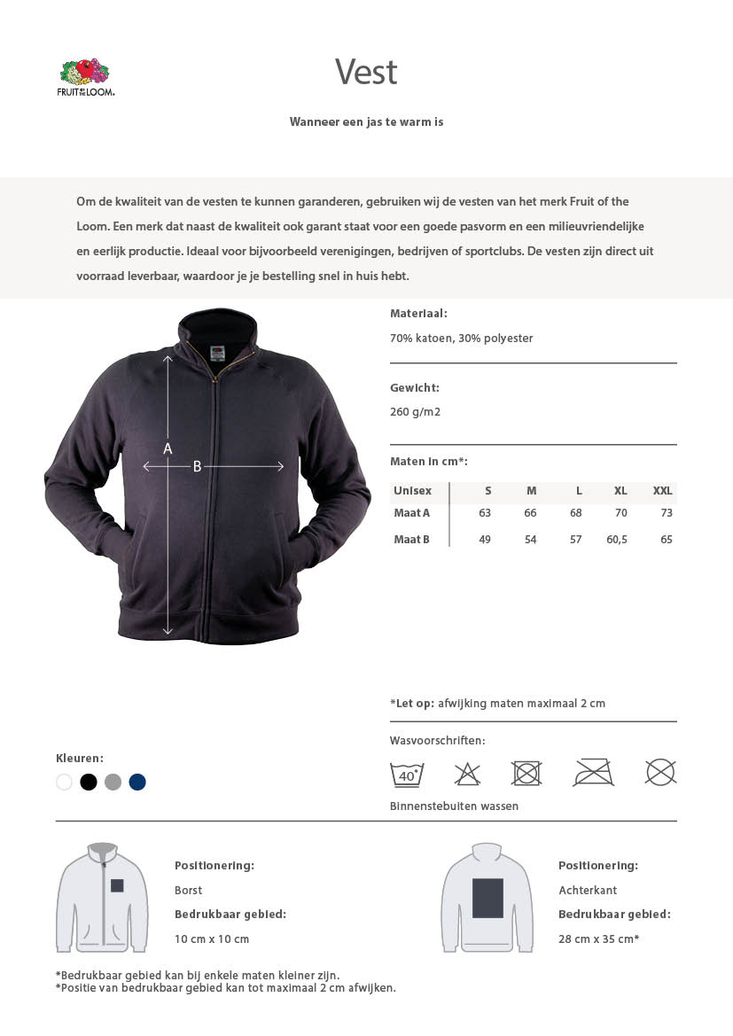 Om de vesten met rits zo goed mogelijk te bedrukken vragen we om een vrijstaand ontwerp, opgebouwd uit CMYK.